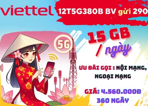 Gói cước 12T5G380B Viettel: Có ngay 15GB/ngày, gọi nội mạng và ngoại mạng, chu kỳ 1 năm