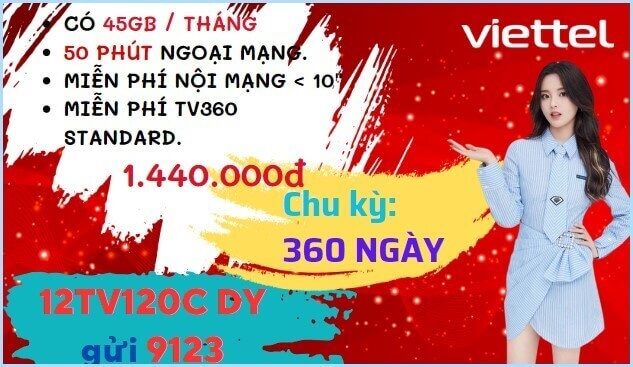 Đăng ký nhanh gói cước 12TV120C Viettel với cú pháp: 12TV120C DB gửi 290. Chỉ với 1.440.000đ cho mỗi lần đăng ký, khách hàng nhận được 1.5GB DATA tốc độ cao mỗi ngày, gọi nội mạng miễn phí dưới 10 phút, mỗi tháng có thêm 50 phút gọi ngoại mạng. Đặc biệt, khách hàng còn được miễn phí DATA, 1 tài khoản TV360 Standard giúp xem truyền hình thả ga.