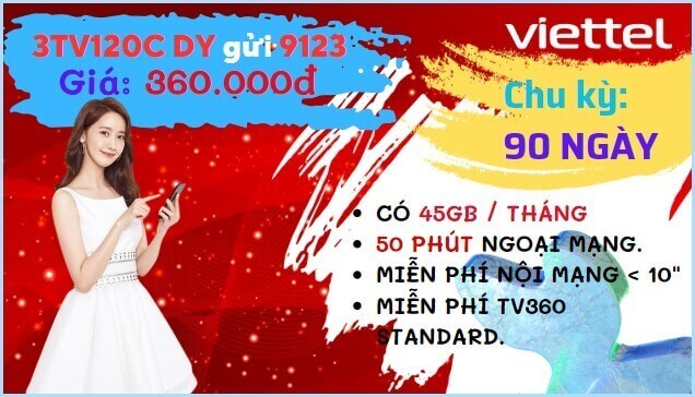 Đăng ký gói cước 3TV120C Viettel, chỉ với 360.000đ cho mỗi lượt đăng ký với cú pháp: 3TV120C DB gửi 290. Khách hàng sẽ có ngay 45GB DATA tốc độ cao mỗi tháng dùng 3 tháng, thoại nội mạng dưới 10 phút được miễn phí. 50 phút thoại liên mạng mỗi tháng được miễn phí. Ngoài ra, còn được miễn phí DATA và 1 tài khoản Standard khi sử dụng TV360.