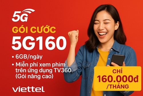 5G160B (160.000đ/ 30 Ngày) | - 4 GB / Ngày - Miễn phí gọi nội mạng <10 phút - 100 phút gọi ngoại mạng - Miễn phí xem phim trên ứng dụng TV360 - Gói cước 5G Viettel | |