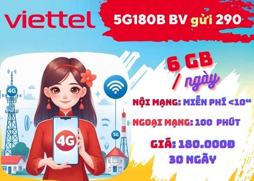 Quý khách sẽ có 30 ngày sử dụng data tốc độ 5G Viettel và liên lạc trong nước thả ga khi đồng hành cùng gói cước 5G180B Viettel. Đây là gói cước tuần rất phù hợp với những thuê bao có nhu cầu online và gọi thoại tần suất cao trên di động. Để đăng ký gói, bạn chỉ cần gửi tin theo cú pháp: 5G180B DB gửi 290. 5G180B Viettel đem lại cho người dùng combo ưu đãi cực lớn.
