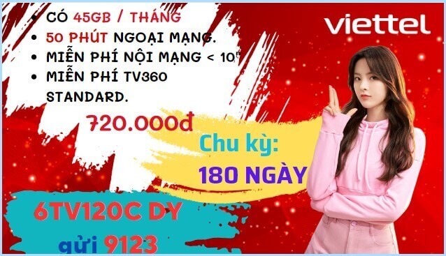 Gói cước 6TV120C Viettel: có 1.5GB mỗi ngày, thoại thả ga, dùng 6 tháng