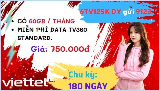 Gói cước 6TV125K Viettel hiện đang được áp dụng triển khai trên phạm vi toàn quốc, khách hàng tham gia gói cước này sẽ nhận được 360GB (2GB/ ngày) dung lượng truy cập tốc độ cao được sử dụng liên tục 6 tháng. Chỉ cần soạn tin nhắn theo cú pháp: 6TV125K DB gửi 290, đăng ký thành công gói cước bạn còn được nhận thêm ưu đãi miễn phí data truy cập vào ứng dụng TV360. Tham gia gói cước 6TV125K là cách để truy cập mạng nhanh chóng, có thời gian sử dụng lâu dài và được tận hưởng nhiều ưu đãi hấp dẫn.