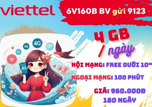 Gói cước 6V160B Viettel là gói có ưu đãi tới 4GB Data tốc độ cao mỗi ngày với giá cước là: 960.000 đồng có chu kỳ 180 ngày. Cú pháp đăng ký gói cước này là: 6V160B DB gửi 290. Ngoài ra, khách hàng còn được miễn phí toàn bộ cuộc gọi nội mạng dưới 10 phút, 100 phút thoại gọi ngoại mạng.
