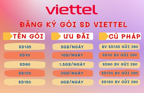 - Gói cước SD135 Viettel: Gói cước này cung cấp dung lượng data lớn hơn so với gói SD70, nhưng giá cả vẫn khá hợp lý. Là một trong những gói cước được lựa chọn hàng đầu nhất.