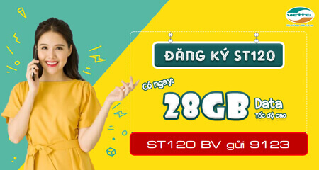 Gói cước ST120 Viettel chỉ với 120.000đ/28 ngày sử dụng. Soạn tin theo cú pháp: ST120 DB gửi 290 bạn sẽ nhận về cho mình 28GB dung lượng data tốc độ cao. Với ưu đãi hấp dẫn này khách hàng chắn chắn sẽ có thể truy cập web thả ga cũng như phát thêm wifi cho những thiết bị quanh mình.