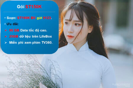 Đăng ký gói cước ST150K Viettel bạn sẽ có ngay 3GB mỗi ngày chỉ với 150.000đ/tháng. Soạn tin theo cú pháp: ST150K DY gửi 290, bạn có cơ hội đăng ký thành công gói cước. Ưu đãi của gói 4G này chưa dừng lại ở đó. Sau khi đăng ký thành công gói ST150K bạn còn được hưởng ưu đãi miễn phí data khi truy cập vào ứng dụng TV360 trong suốt 30 ngày.