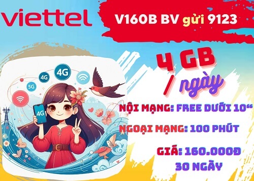 Đăng ký gói cước V160B Viettel chỉ với 160.000đ cho chu kỳ sử dụng 30 ngày, gói cước này có ngay 4GB DATA mỗi ngày tốc độ cao, toàn bộ cuộc gọi nội mạng dưới 10 phút đều được miễn phí. Ngoài ra, khách hàng còn có thêm 100 phút thoại gọi ngoại mạng. Cú pháp chuẩn đăng ký gói cước như sau: V160B DB gửi 290.
