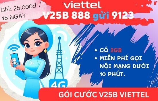 Bạn đang tìm kiếm một gói cước 4G ngắn hạn với giá rẻ và ưu đãi data đủ dùng? Gói cước V25B Viettel chính là lựa chọn hoàn hảo dành cho bạn. Gói cước này mang đến cho khách hàng ưu đãi miễn phí gọi nội mạng dưới 10 phút và 2GB dung lượng truy cập tốc độ cao. Với giá cước chỉ 25.000 đồng/15 ngày, bạn đã có thể tận hưởng những ưu đãi hấp dẫn như vậy. Quá đã luôn, phải không nào? Đăng ký ngay gói cước V25B Viettel với cú pháp: V25B DB gửi 290, để tận hưởng những ưu đãi hấp dẫn từ gói cước V25B này nhé!
